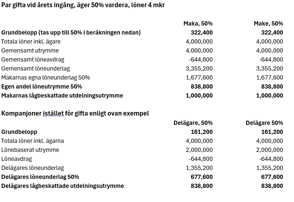 Det finns även en nyhet i att gifta makar ska göra en gemensam beräkning och då endast ta hänsyn till löneavdraget om åtta inkomstbasbelopp en gång. För makarna totalt sett så gäller det då en förbättring om fyra inkomstbelopp i familjen, vid 50-50 ägande, jämfört med kollegor med lika ägande. Värt att notera är att det finns ett krav att man är gifta vid årets ingång.